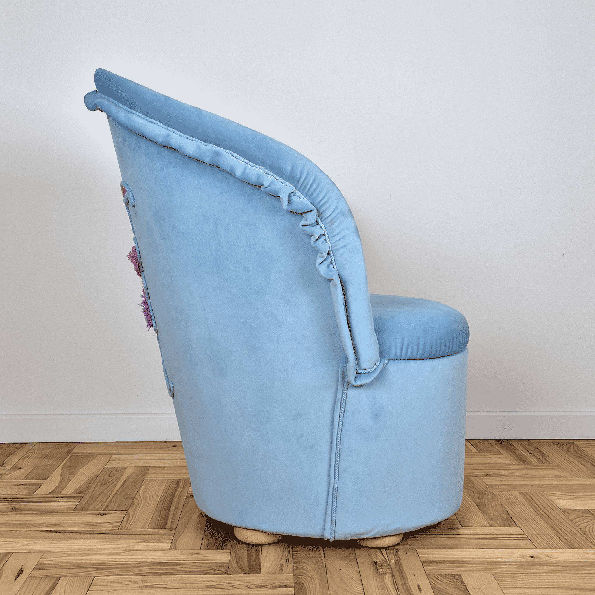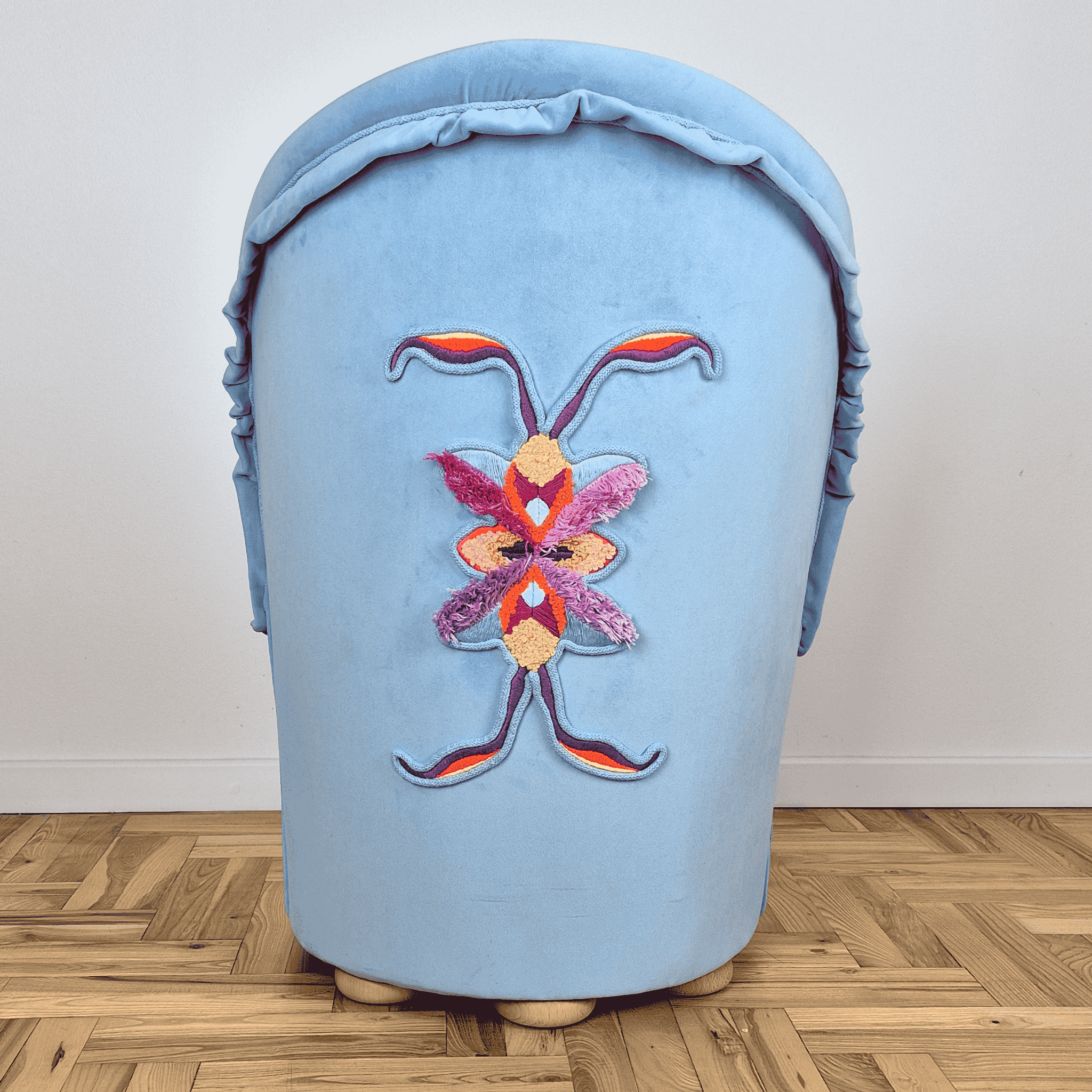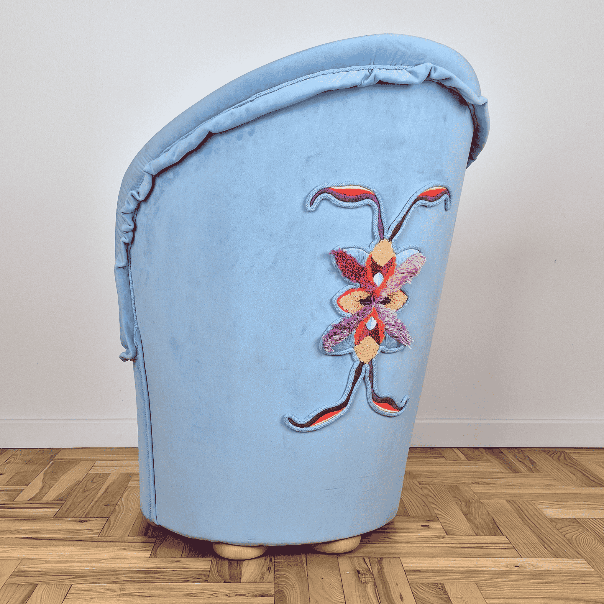 Ręcznie wykonany fotel tapicerowany z unikalnym haftem ręcznym.